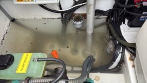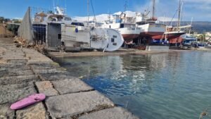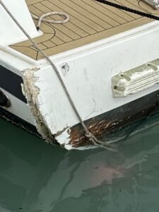 Wir sitzen bei einem Becher Glühwein und genießen den frühen Untergang der Sonne hinter dem nur spärlich weißen Bergmassiv. Eine Nachricht kommt herein. Sie zeigt das Bild eines zerfetzten Bootshecks. Wie eine klaffende Wunde, die umgehend genäht werden muss, sieht das aus. Auf einem weiteren Foto ein Motorraum, der soweit unter Salzwasser steht, dass der Motorblock zur Hälfte darin verschwindet.