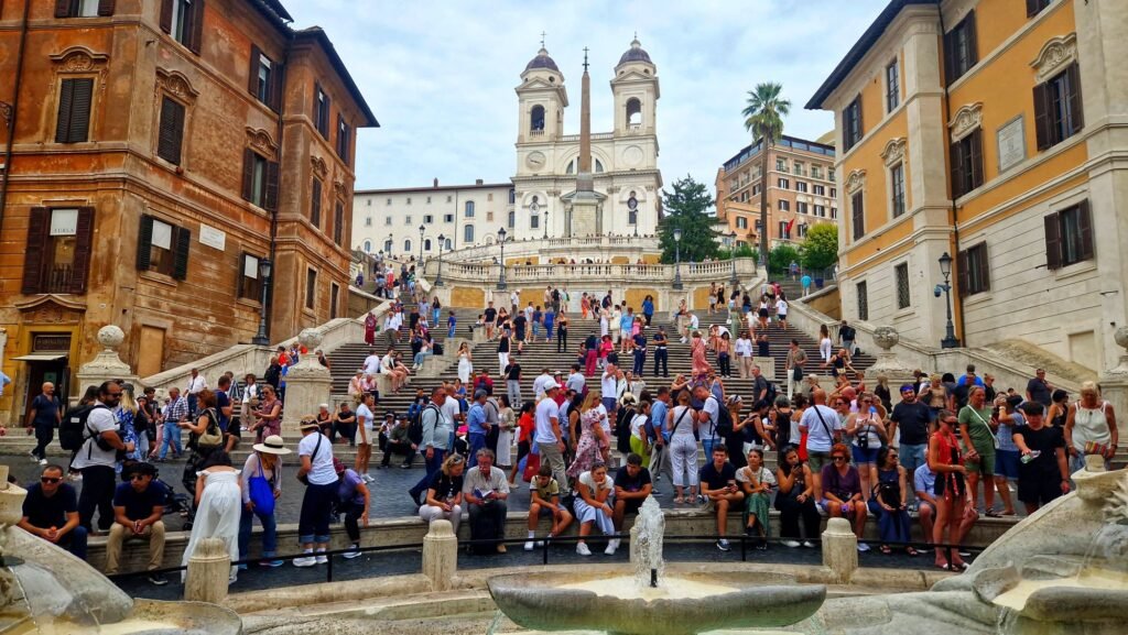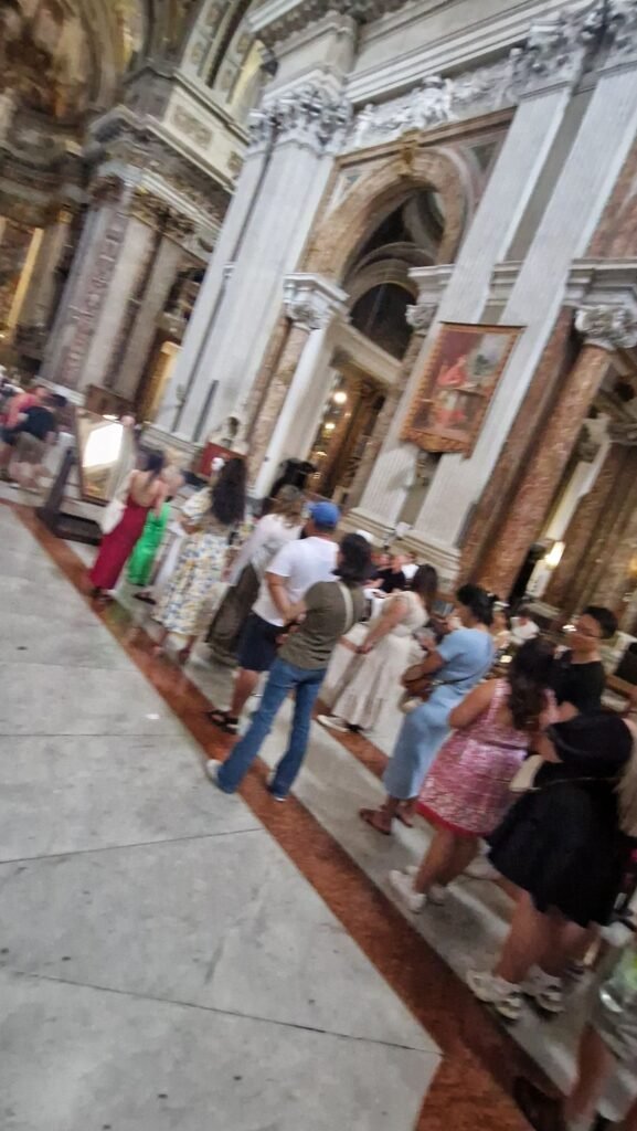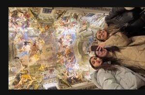 Eine der vierhundertvier Kirchen der Stadt ist Ignazio di Loyola gewidmet, dem Mitbegründer des Jesuitenordens. Sie liegt, nach Kaffee und Foto am Neptunbrunnen, auf unserem Weg zum Pantheon und weil das Hauptportal offen steht und sich dort eine Menge junger Menschen tummeln, lasse ich mich von dem Ort anziehen. Ich gehe hinein, bestaune das farbenfrohe Deckengemälde über mir und wundere mich über das seltsame Verhalten der Leute vor mir. Sie stehen – dreißig, vierzig überwiegend junge Frauen sind es –, aufgereiht vom Eingang bis zum schräg auf einem Sockel ruhenden großen Spiegel, über den sie sich nacheinander, wie einem Schrein huldigend, beugen. Fast andächtig. Wenn sie dort nicht alle ihr Smartphones zücken würden. Ich brauche eine Weile, um zu verstehen: Der Spiegel liefert das Selbstbild vor den gewaltigen Fresken, die perspektivisch komponiert sind. Die Architektur setzt sich scheinbar in der Malerei fort. Dargestellt ist die Apotheose des Hl. Ignatius. Er steigt über den damals bekannten vier Kontinenten zum Himmel empor und der Blick an die Decke reicht quasi ins Unermessliche. Es ist eines der kühnsten Werken illusionistischer Malerei, das Andrea Pozzo ab 1685 über ein Jahrzehnt lang geschaffen hat. Jetzt, dreihundertvierzig Jahre später, dient es als Kulisse für das Selbstverliebte, das in der Welt verlorene immergleiche Ich, hochgeladen auf Tiktok im Minutentakt. Die lange Warteschlange der amerikanischen Touristen vor der Eisdiele in San Gimignano letztens  erscheint mir plötzlich – menschlich.