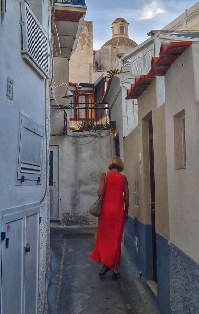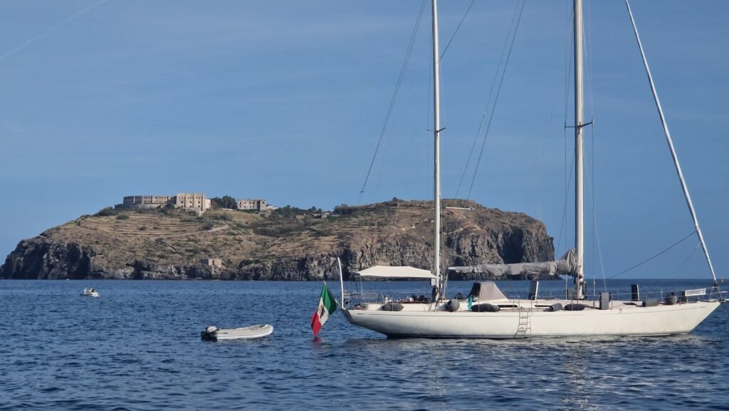 Die kleine Insel mit pastellfarbenen Häuschen, hübsch anzusehen, zählt zu den Pontinischen. Ihr alter Hafen ruht sichtbar auf römischen Grundmauern. Unser Katamaran ist zu breit für die Hafeneinfahrt. Wir ankern in der Nähe, um mit unserem neuen Paddelboot einen kurzen Weg an Land zu haben.
