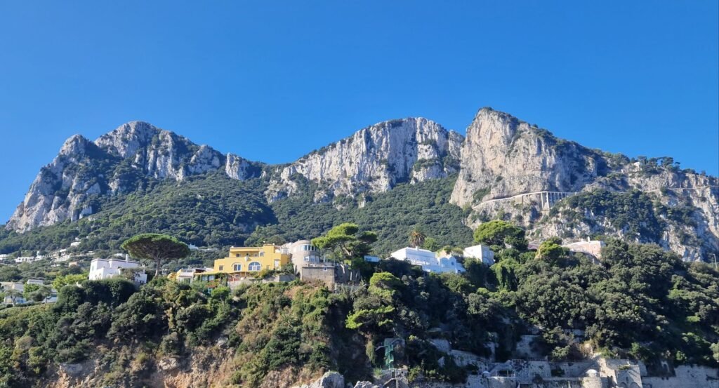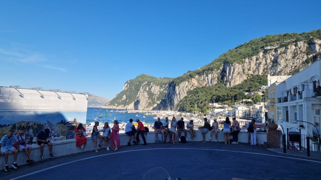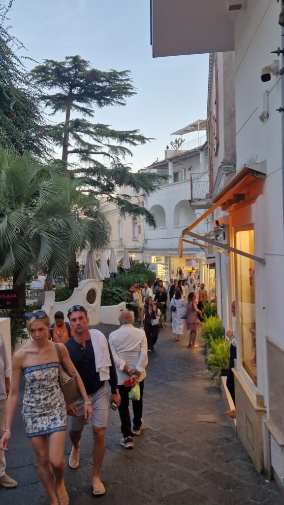 Die Häuser im Zentrum Capris sind stilvoll, gepflegt und stehen im krassen Kontrast zu allem, was wir sahen, seit wir die Toskana hinter uns gelassen haben. Allgegenwärtiges Symbol ist die prächtig-pralle Zitrone. Eine Insel aus Reichtum und Überfluss. Die Menschen bewegen sich darauf wie als Teil eines exotisch kunstvollen Ganzen. Es wirkt wie ein Versuch, die Grenzen zwischen Kunst und Leben zu überwinden, wenn sie am Abend in den Gässchen des verwunschenen Ortes und auf dem zentralen Platz vor der Kirche ihr  Schaulaufen abhalten, wenn auffallend attraktive und gepflegte Frauen an den Schaufenstern der Boutiquen vorbeischlendern, als würden sie sich dafür interessieren, während es ihnen doch vor allem darum geht, gesehen und bewundert zu werden. Dazu ein Mann an ihrer Seite, oft aus gutem Hause, aber auffallend öfter einer, der aus seiner Rolle fällt. In Shirt und Shirts mit Schlappen, ein schlurfender Gang, ein ungepflegter Bart. Kaum vorstellbar, dass hier gegenseitige Zuneigung im Spiel ist. Aber wer spielt hier welche Rolle?